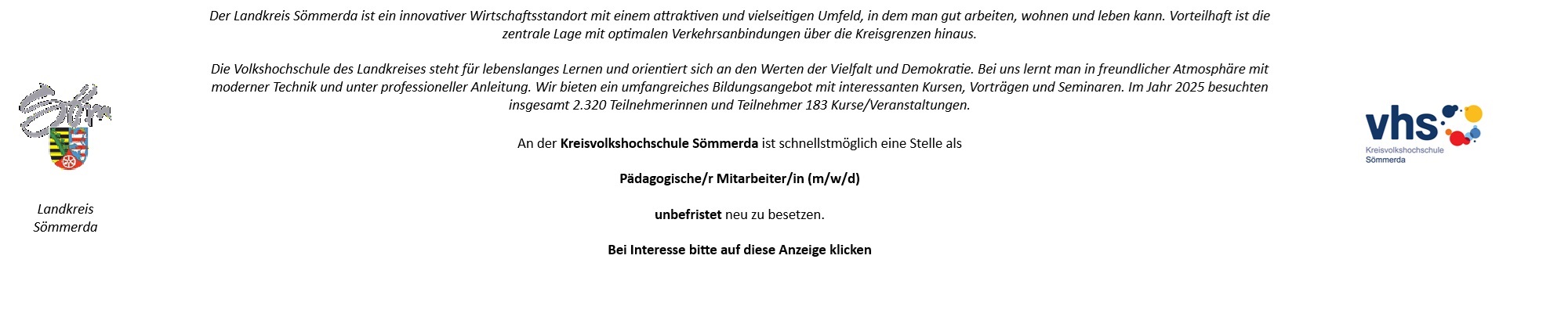 Herzlich willkommen in der Volkshochschule des Landkreises Sömmerda. Wir stehen für lebenslanges Lernen und orientieren uns an Werten der Vielfalt und Demokratie. Bei uns lernen Sie in freundlicher Atmosphäre mit moderner Technik und unter professioneller Anleitung. Wir bieten Ihnen ein umfangreiches Angebot mit interessanten Vorträgen und Seminaren. Erweitern Sie Ihre Kenntnisse in Sprach- und Gesundheitskursen oder betätigen Sie sich gestalterisch. Wenn Sie Ihre beruflichen Perspektiven verbessern oder Einblicke in die digitale Welt erhalten wollen, dann werden Sie auch hier bei uns fündig. Ein Besuch auf unserer Webseite lohnt sich. Wir beraten Sie natürlich auch gern persönlich vor Ort.